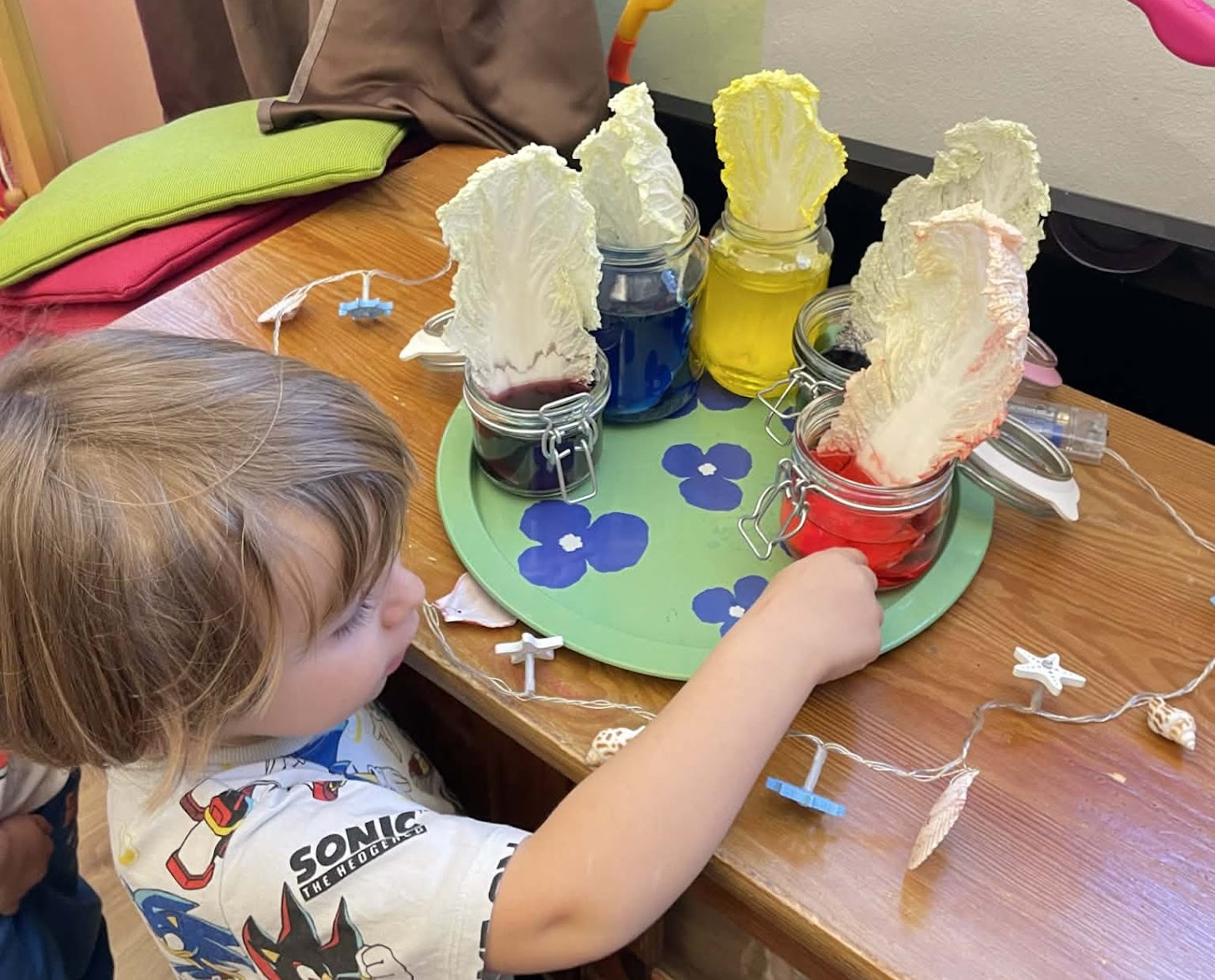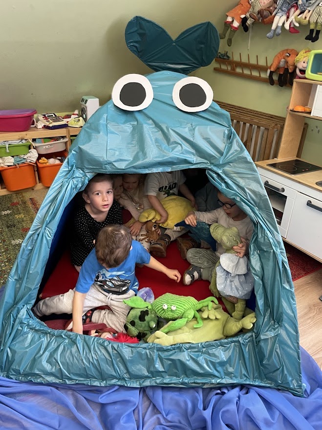 Ezért a Víz világnapja köré minden csoportunk tematikus heteket tervezett. A legkisebbek számára Barcza Sára egy bálnát "varázsolt" a csoportszobába, játékos módon ismerkedtek a gyerekek a vízi állatokkal. Bebújhattak a belsejébe, megvizsgálták, mi van a gyomrában, mi mindent fogyasztott el. Meséket hallgathattak benne (pl. A tulipánná változott királyfi meséjét), amelyben szerepelnek nagy halak.